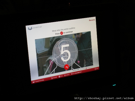 接著呢,螢幕上會要求演員站定位,通常是“坐”啦,坐在螢幕上白線框出的地方。注意得擺好要求的姿勢喔,正面或側面啦,遠近大小啦,填滿要求空間。